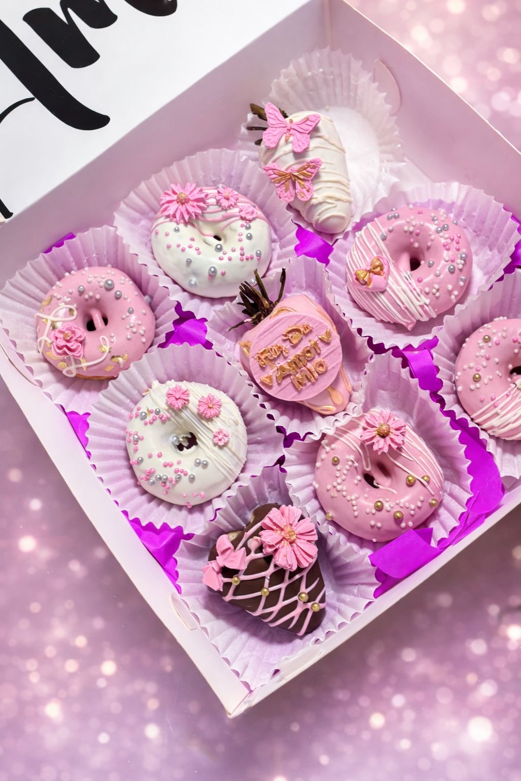 - Combo 2 en 1: mini donas + fresas con chocolate premium.